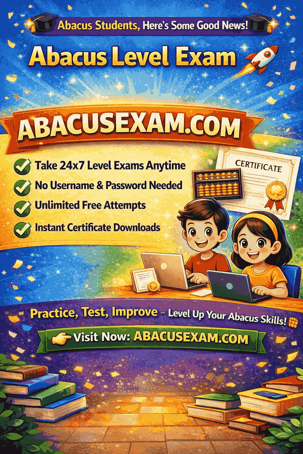 Abacus training boosts brain development, concentration, memory power, and faster problem-solving skills. Regular Abacus level exams focused on additions and subtractions help students track progress, overcome math fear, and perform better in school exams. By practicing Abacus daily and supplementing with Abacuswala.com exercises, kids develop strong calculation skills and confidence in handling numbers.